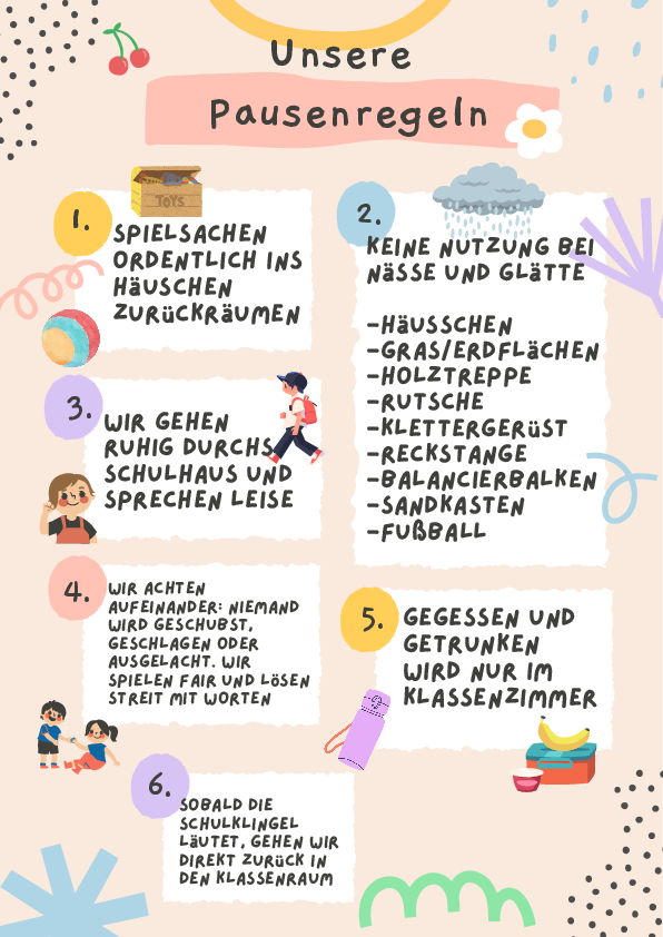Teil unserer Hausordnung sind weitere Regeln wie unsere Pausenregeln, unsere Hallenregeln, die Regelung für die private Nutzung digitaler Endgeräte an der Grundschule Wallertheim sowie die gesetzlichen Vorgaben wie die Schulordnung, die Grundschulordnung, die Hygieneverordnung in der jeweils aktuellen Fassung.